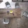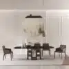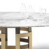 Table with elliptical, barrel shaped or rectangular top, fixed or with extentions, in Veneer wood, Veneer wood with solid edge, Solid wood with natural edge, Glossy glass, matt Velvet matt anti-scratch lacquered glass, SuperCeramic, SuperMarble or natural marble. Lacquered metal bracelet shaped frame.