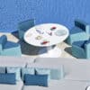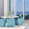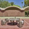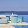 Eight segment armchairs are arranged radially around the Big Low table, creating an outdoor space where you can get comfortable and spend whole days.