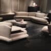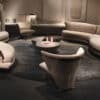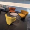 Hugging padded armchair, chrome-metal parts. Covered with fabrics or leather from our collection.