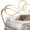 The laser-cut steel plate frame with wire feed welds is curved, brushed and polished entirely by hand. The champagne silver leaf finishing is carefully applied by our skilful craftsmen. The wooden bedframe, with aluminium-cast feet, is upholstered in eco-leather or customer-provided fabric. Together with the chest of drawers and the bedside tables, it is perfect for a lively and romantic bedroom.