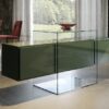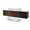 Sideboard in wood with 4 leaf-doors with internal partition and 1 folding door, available in Canaletto walnut, shiny ebony wood or in shiny or matt lacquered finish. Central support in extra-clear glass 15 mm thick