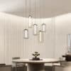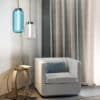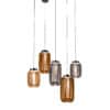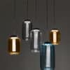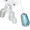 Pendant lamp in artistic glass in the colours: transparent, acquamarine, straw-yellow. Inner shade in Rugiana finish glass. Support in polished chromed metal and canopy in black metal and glass. Led lighting with 3W GUA spot and 2W Strip