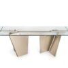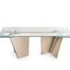 Extensible dining table, with top and extensions in glass. Base and track in painted metal. A very easy patented mechanism to pull out the lateral extensions allows the widening of the top of cm 80 (31.5 inch). Available also with ceramics tops.