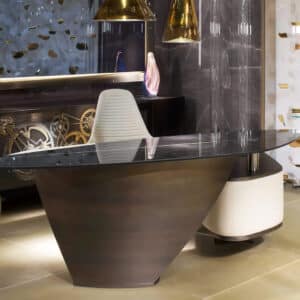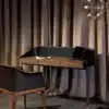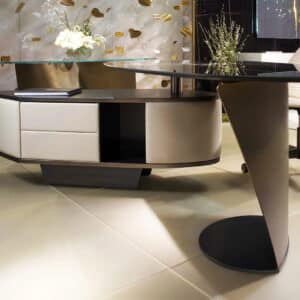 The Ledor desk combines the solid wooden structure in Canaletto walnut or black ash finish, with the refined rise of the thick-leather top: the result is a highly effective desk, suitable for any environment.