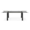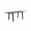 LEVANTE table with material mixture: wooden base, metal guides and glass top.