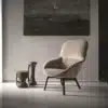 Armchair with three different frames, shell with metal insert, upholstered in foamed polyurethane and covered in Premium Technical velvet, tessuto Nordic, Pure Virgin Wool, Kvadrat field and Kvadrat Coda fabric, Premium Nappa Leather.