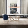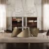 Chair with wooden structure and padded seat and back. Legs in oakwood Beluga or in Bronze, Bras, dark Brass, Titanium. Upholstery all in leather or all in Amsterdam fabric or mixed with the external back in leather and the interior in fabric. Available with or without arms and with quilting on the back.