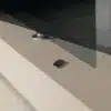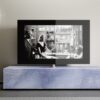 Tv-stand. Low cabinet with one folding door in wood covered with lacquered or etched lacquered glass. Optional rotating TV-Support with motor and remote-control.