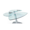 Desk with shaped tops in tempered 15 mm thick glass. Metal base and supports in bronze finish. Optional round glass shelf for printer