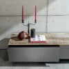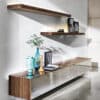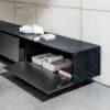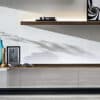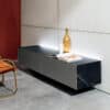 Customizable suspended sideboards system. Structure and doors available in mirror or ceramic, various finishes, with or without brass finish profile. Available with or without led. Metal supporting structure and optional feet included.