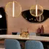 Boule lamp with a luminous tube in the center of the spheres, suspended by a light metal wire, also available in the table lamp version.