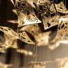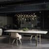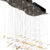 The ceiling lamp is made with a metal structure with a cylinder-shaped matt black part and a shaped brass part; the suspended elements are made using a chemical photoengraving technique and are held by transparent wires at a custom height. Each suspended element stands alone, while the movement of a single piece transmits the movement to the pieces next to it creating a uniform “behaviour”. The design of these elements is based on the detail of the decorative surfaces which create transparent and reflective effects. A modern and sophisticated design for a chandelier perfect for the dining area.