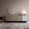 There is an appealing geometric balance in this range, resulting from the combination of different materials and differences in thickness. Smooth, uniform doors in a lacquered finish are flanked by doors framed by metal frames with a recessed panel designed for the addition of precious finishes. This brilliant aesthetic concept creates a pleasant interplay of visual and tactile contrasts.