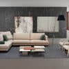 Metal frame padded in resilient polyurethane foam. Linear back cushions with inserts. The series includes: armchairs, two and three seat sofas, corner sectionals, chaise longue and ottoman.