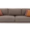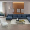 Sofa with a metal frame incorporated within the resilient urethane foam padding. All-feather cushions for the seating and backrest with leather upholstery. The series comprises armchairs, linear and corner sofas with chaise longues, poufs, and small padded tables.