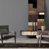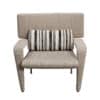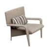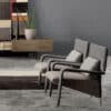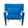 Metal structure padded with resilient urethane foam. Padded arms, a padded wedge-shaped back support cushion. Covered in fabrics or leather from our collection.