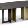 The Mirage 2 shaped table has a base formed by a curved steel plate that creates an incredible perspectival play of different shapes.