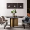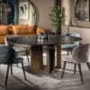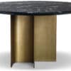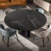 The Mirage round table has a base formed by a curved steel plate that creates an incredible perspectival play of different shapes.