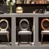 The structure is made in laser-cut solid iron, curved, smoothed and polished by hand, and wire welded. The seat, in profiled wood padded with rubber, is upholstered in fabric, leather, or customizable with any fabric supplied by the customer. Removable cover.