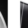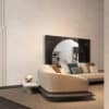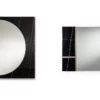 Collection of mirrors in extra-clear glass. Model A in semicircle applied to a rectangular panel in MarmoReflex or LegnoReflex. Rectangular Model B with inserts in bronze finish and in Marmoreflex or LegnoReflex.
