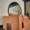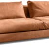 The Montecarlo linear sofa, with either two or three seats, has a solid beech and poplar wood structure with plywood inserts. The springing is guaranteed by non-deformable elastic belts. The structure is covered with a highdensity polyurethane foam in different densities, the upper layer having a high elastic component. The back cushions are non-deformable and with differentiated density, with an upper layer of feathers and a synthetic layer. The sofa is completed by a bronzed, laser-cut metal plate.