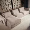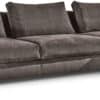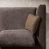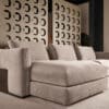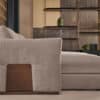 It is also decorated with a stylish metal detail. 3- or 4-seater corner sofa, consisting of a linear module and the chaise longue. Its internal structure is in solid beech and poplar, with plywood inserts. The springing is guaranteed by non-deformable elastic belts. The structure is covered with a high-density polyurethane foam in different densities, the upper layer having a high elastic component. The cushions are nondeformable and with differentiated density, with an upper layer of feathers and a synthetic layer. A laser-cut bronzed metal plate envelops the sofa in a warm embrace