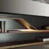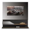 Mirror/TV container in Supersilver mirror with black serigraphy for LED TV (7cm maximum thikness) with frames in matt lacquered wood Henné colour. Joint to a special module of Segno Libreria (Pininfarina design) with shelf available in matt lacquered finish, Canaletto walnut or Canaletto Henné or in the metallic finishing.