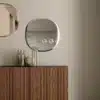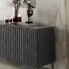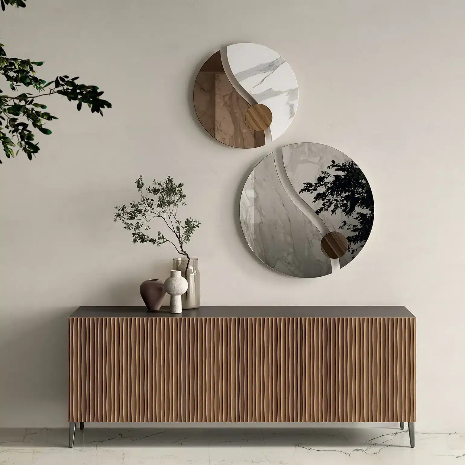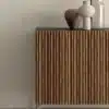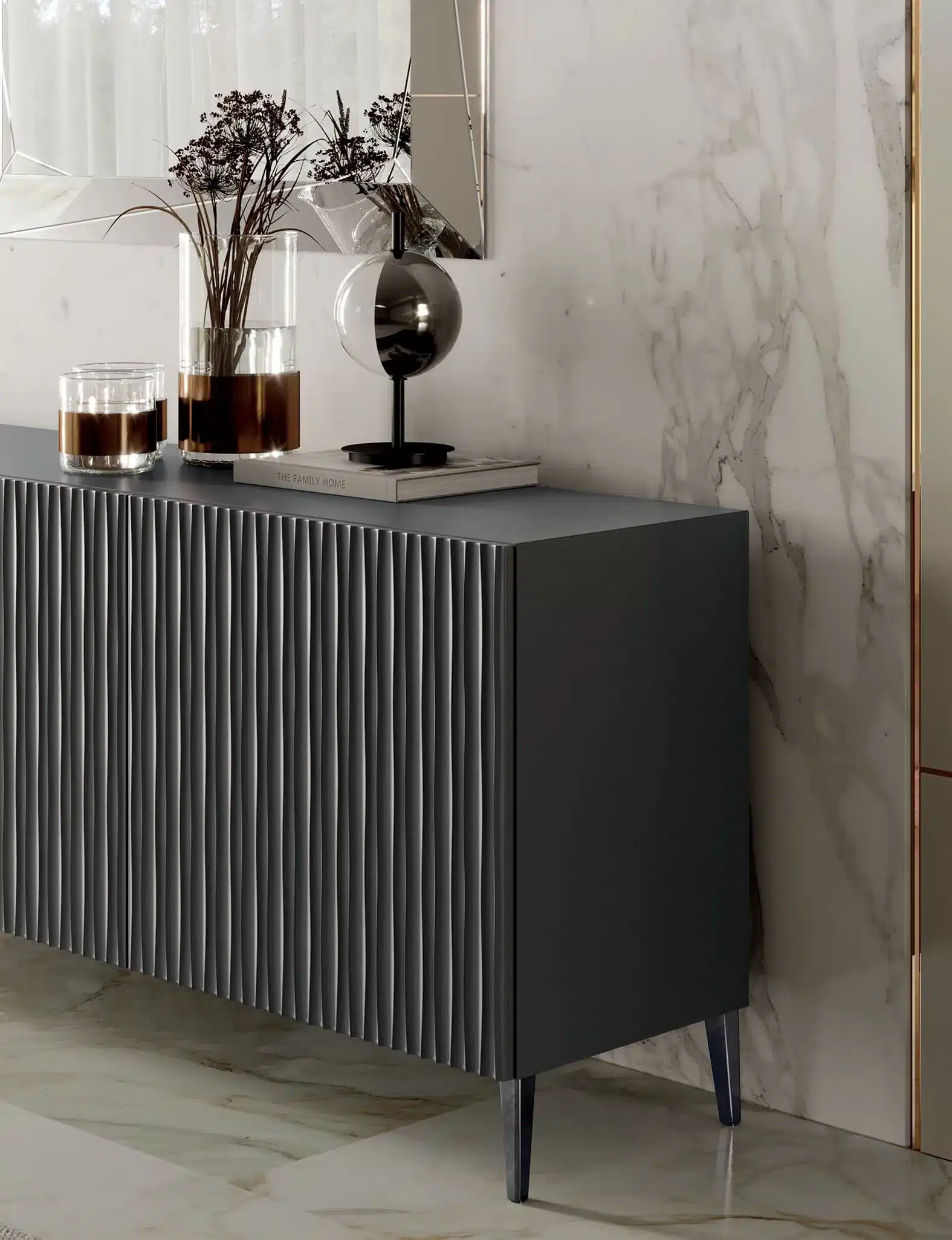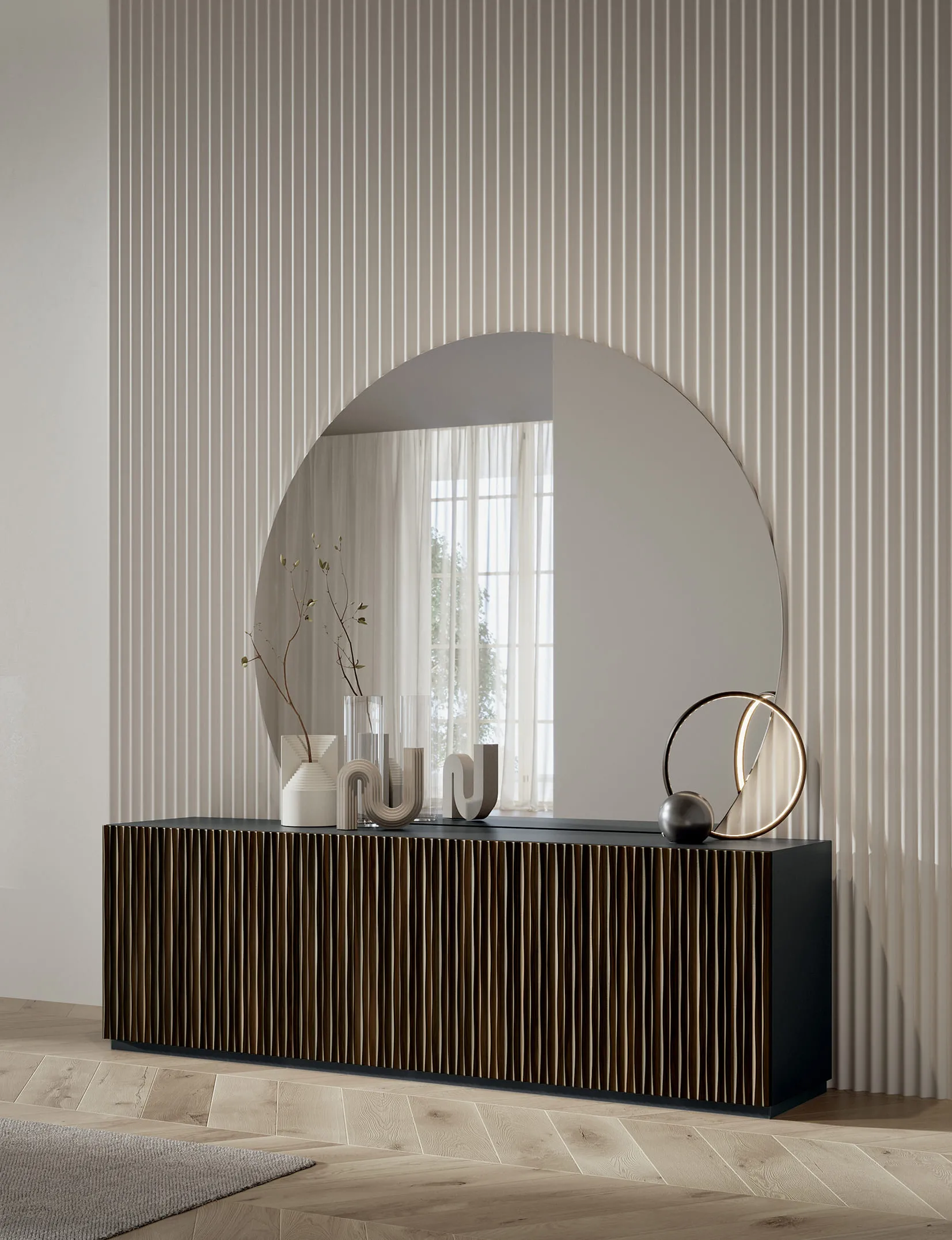 Sideboard with wooden frame with 2 doors, inside shelves in clear glass. Side panels in laquered wood and frontal panels in lacquered wood and veneer. Optional top in trasparent extra clear glass and mirrored inside drawer.