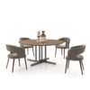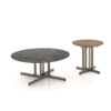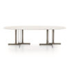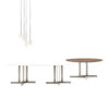 A collection of tables with a contrasting wood, marble or glass top resting on an extremely light frame. The very thin metal blades of the base allow it to be used either separately or in pairs, for round, oval or rectangular tables.