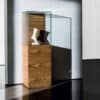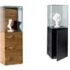 Case with oak veneered wooden structure 30 mm. th., natural or wengé finish. Closed extralight clear glass top. Available in the middle room or wall free standing versions. The base can be also a useful case with openable door.