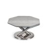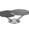 EXTENDIBLE COFFEE TABLE WITH SYNCHRONIZED REVOLVING TOPS IN GLASS. BASE AND SUPPORTS IN PAINTED OR GALVANIZED STEEL. THE BASE IS EQUIPPED WITH A MECHANISM FOR THE SYNCHRONIZED ROTATION OF THE TOPS THAT ALLOWS AMPLE MODULATION OF THE SHAPE. AVAILABE ALSO WITH CERAMICS TOPS.