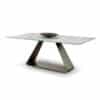 Dining table with base in curved steel in Bronze, Brass, dark Brass or Titanium finish. Top in MarmoReflex/Legnoreflex or in Bevel Wood in Canaletto walnut/Canaletto Henné or with edges matching the base and a cover in Marmoreflex/Legnoreflex glass
