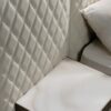 XL version of the OH bed which maintains the rounded frame in Bronze, Brass, Dark Brass, Titanium finish with LED lighting and touch switch. Padded headboard upholstered in leather or fabric with quilting. Plain bed frame. Optional: wooden shelf with drawer in Bronze finish and top in Marmoreflex; arrangement to install switches and sockets, storage with lifting slat.