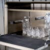 2 suspended doors with push-pull opening in Canaletto Walnut, Canaletto Henné, Rovere Beluga, shiny Ebony or covered with leather with quilting at your choise. Equipped with glass shelves.