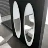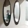 The Olmi mirror is reminiscent of a pair of ellipses, slightly widened downwards, which have come out of each other. The first, the base, silk-screened or bronzed in various finishes, leaves room inside for the real mirror, also bronzed or silvered.