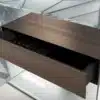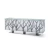 Buffet with two or three doors in extraclear etched glass. Available in 2 different heights with adjustable metal feet or metal base in aluminium colour. Equipped with lighting system and glass shelves. Top in bush-hammered finish and a wooden drawer for the 3-door-version. Available also with TREE pattern design.