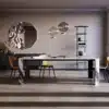 The Panta Rei table draws inspiration from nature and the flow of becoming. The screen-printed glass explores the expressive potential of materials. 12 mm thick glass showing the veining of marble in a new way and creating the organic effect of a flow in a striking table that enhances the identity of any room.