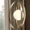 Floor/ceiling lamp dimmable by remote control, with borosilicate glass sphere, as sandblasted, and metal finishes frame.