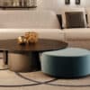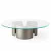 Coffee table with bases in 10mm thick extra-clear curved glass with internal Bronze finishing or in satin brass, dark brass, titanium. Bevelled top in extra-clear or bronze glass, in MarmoReflex or LegnoReflex.