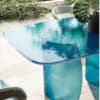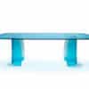 Dining table featuring a base and top in Acqua glass available in fumè, transparent, amber, blue, and emerald colors.