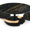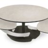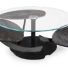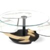 EXTENSIBLE COFFEE TABLE EQUIPPED WITH AN INNOVATIVE MECHANISM THAT THROUGH THE UPPER ROUND TOP 360° ROTATION, ALLOWS THE LOWEST 3 SMALL TOPS TO OPEN AUTOMATICALLY. IN CLOSED POSITION THE LOWEST SMALL TOPS ARE HIDDEN BY THE ROUND UPPER TOP.