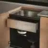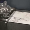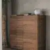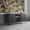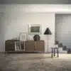 Wooden sideboards with hinged doors und open spaces, side panels and doors in Veneer wood, top to choose. Base or frame with feet in lacquered metal.