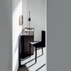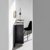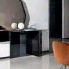 Console with smoked laminated glass top. Base composed of a wooden element, various finishes, and a black lacquered glass element.