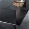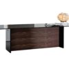 Dining table with extralight clear or smoked laminated glass top. Base composed of a wooden element, various finishes, and two black lacquered laminated glass elements.