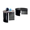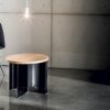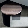 Round coffee table with oak veneered wooden top, 26mm.th., various finishes. The base is composed of a smoked glass element and a lacquered black bent glass element.