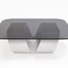A single bent metal sheet folds creating a ring that grows, evolves and develops in two directions, which are at the same time two points of support for the glass that completes the coffee table.