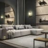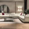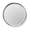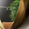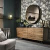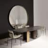 Rodin: the geometric perfection of the round mirror meets the frame, formed by two intertwined steel bands which form a circular design encapsulating the mirror, which is supported by a wooden structure.