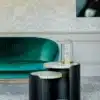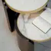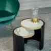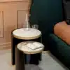 Roller tables are formed by a curvature of the wood and a porcelain stoneware, top embellished with a ring characterized by a brass finish.