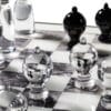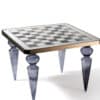 Play-table with Murano glass legs available in smooth finish, clear or coloured or in ribbed finish, transparent or gold. Wooden top with rounded corners in the satin metallic finishes and inlay in Marble glass with chessboard design.