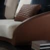 Metal legs in bronze, brass or titanium satin finish. Wooden platform in Canaletto, Canaletto Henné or in the metallic finishing bronze, brass or titanium or in shiny Ebony wood. Upholstery available in fabric or in leather, also mixed together.